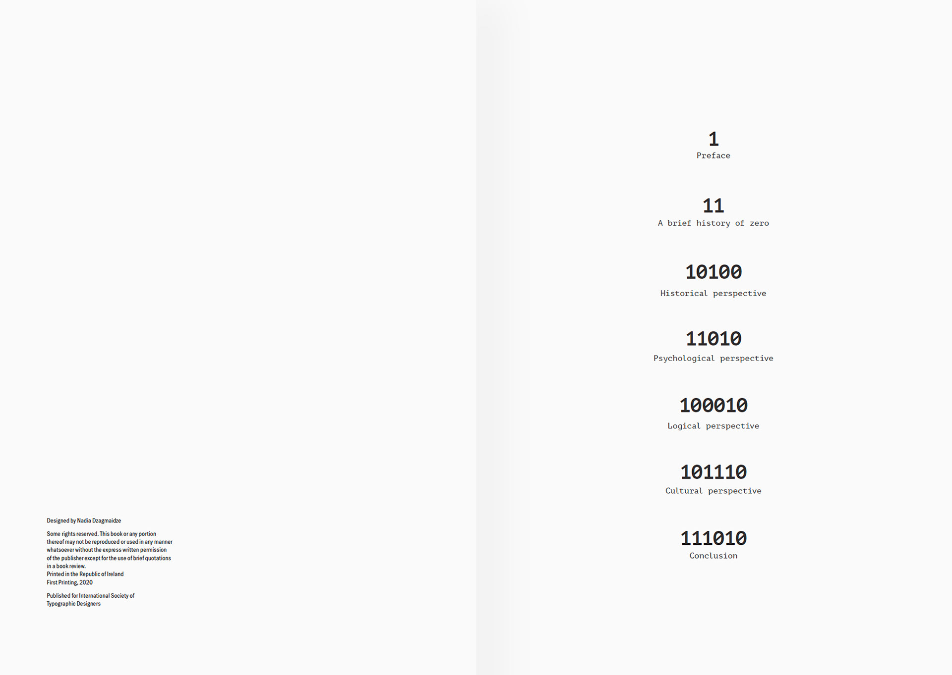 Form, function, content and target audience are factors that influence the design approach. The layout intended to be comprehensible and somewhat playful, allowing the reader to engage with the text in contrast to a standard maths textbook. Big and bold elements of the layout attract readers attention to communicate the concepts within the narrative. The content divided into chapters where each narrative is interpreted through different type forms of number zero.